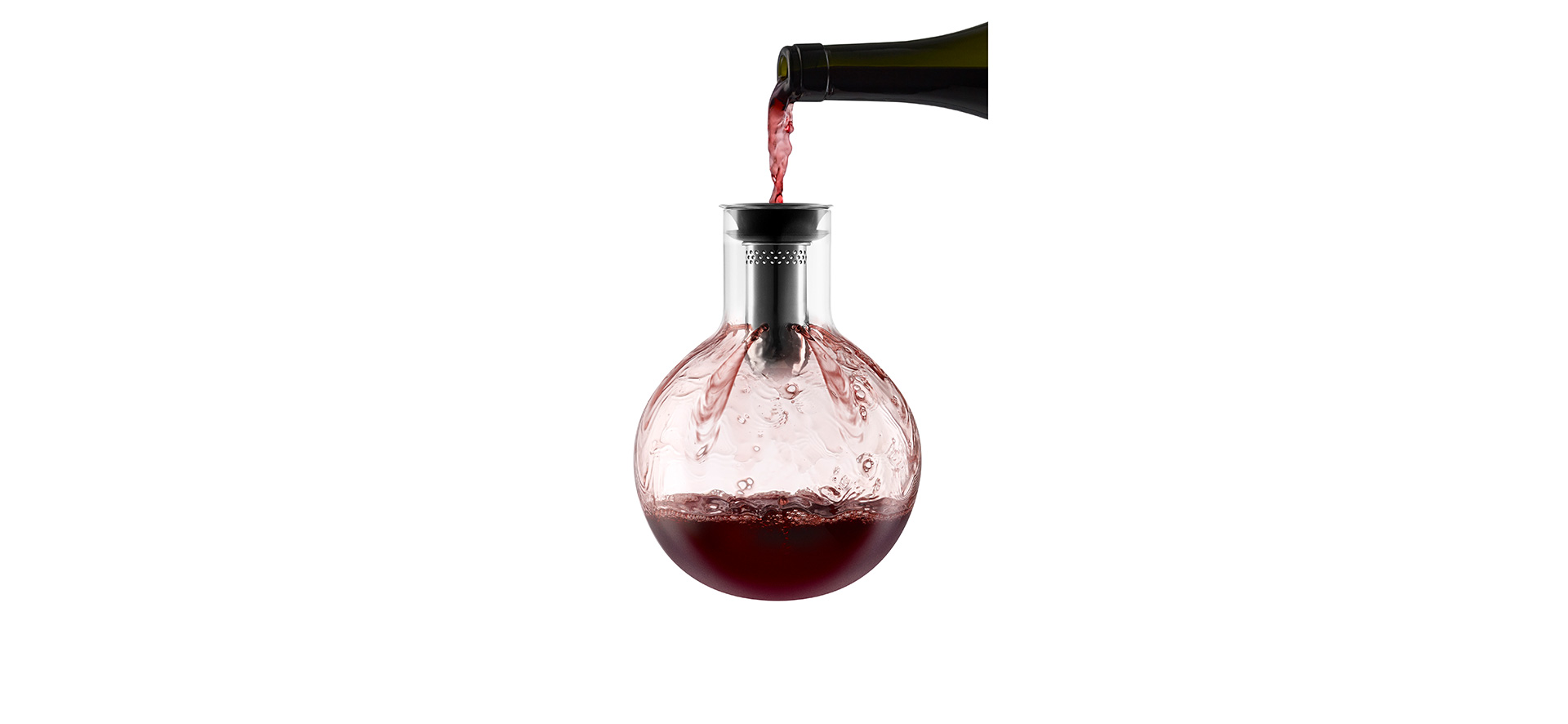 Dans le gouleau de la carafe par Eva solo, il y a un filtre en acier inoxydable, qui sert à plusieurs fins : tout d’abord il empêche les restes de liège du bouchon de tomber lors du service, dans le vin. Le filtre permet aussi la distribution uniforme du contenu de la carafe, de telle sorte que le nectar puisse respirer de façon optimale et développer son arôme.
