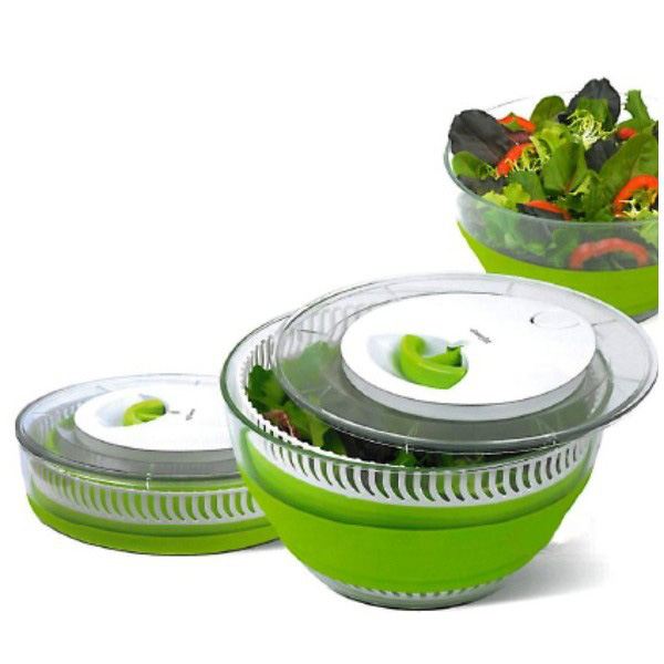 Cette essoreuse est efficace et très résistante et en plus elle se fait toute petite une fois que vous n’avez plus besoin d’elle. En effet le panier et le bol extérieur sont constitués d’un soufflet suffisamment rigide pour la maintenir en position haute et suffisament flexible pour les rabattre lorsque vous appuyez dessus. Un produit vraiment qualitatif et astucieux qui ne mesure plus que 8 cm une fois replié.