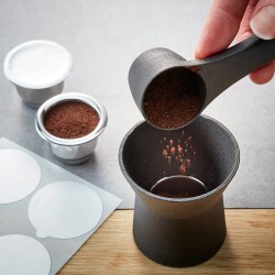 Durable et économique à la fois, c’est ainsi que çà marche : placer l’entonnoir sur la capsule vide, remplir d’expresso avec la cuillère doseuse, tasser la mouture à l’aide du tamper, refermer la capsule avec le couvercle autocollant protecteur d’arôme et voilà !
