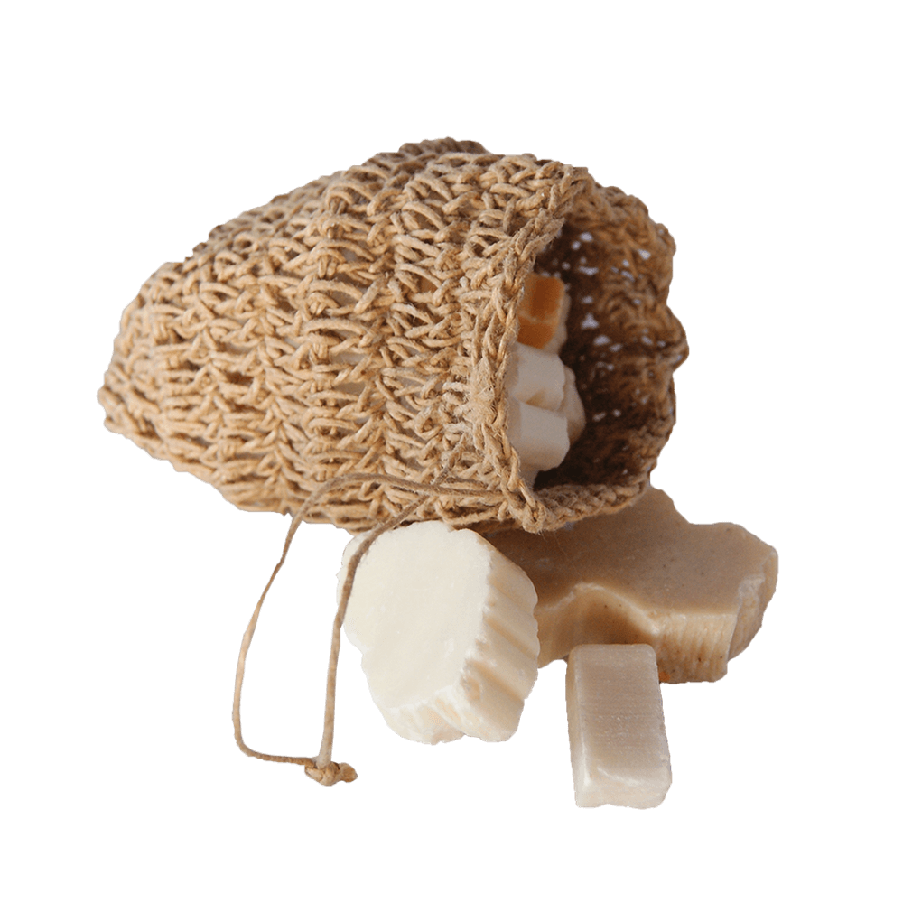 Petit sac en sisal crocheté fabriqué à la main qui sert à recycler vos petits morceaux de savon.