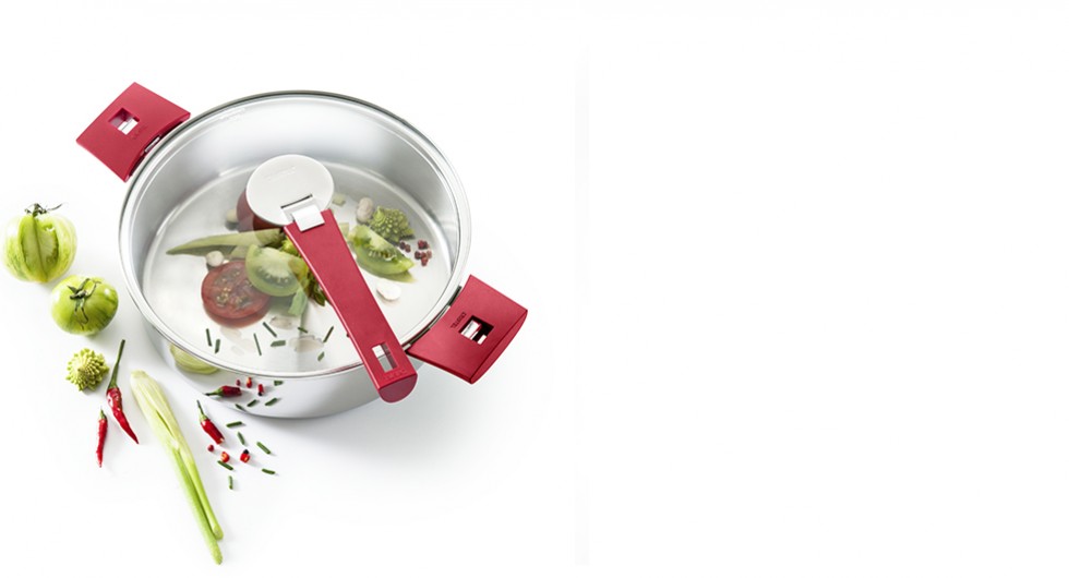 Emblème du concept « Cuisson-Service », la sauteuse inox passe de la cuisine à la table et se transforme en plat de service en se parant de 2 anses.