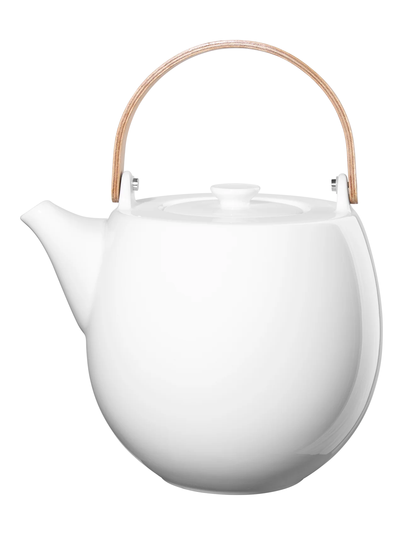 Une théière élégante et raffinée en porcelaine blanche brillante avec une poignée bois
